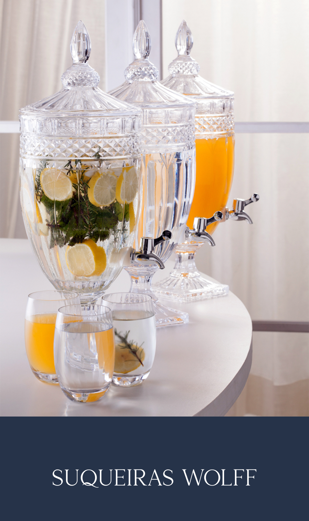 Os vidros Wolff, como jarras, potiches de cristal e os famosos vasos italy, são feitos com matéria prima de alta qualidade, combinando lapidação precisa e detalhes refinados. São ideais para composições clássicas ou contemporâneas.
