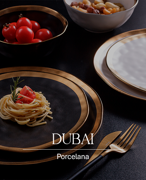 - Linha Dubai Wolff: itens de mesa posta em porcelana com um toque moderno de dourado