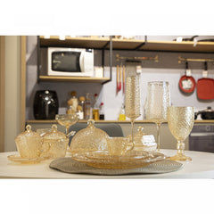 A tonalidade âmbar metalizado confere um toque de calor e glamour à taça, criando um contraste elegante com o design martelado. Uma escolha que destaca sua preferência por peças distintas.